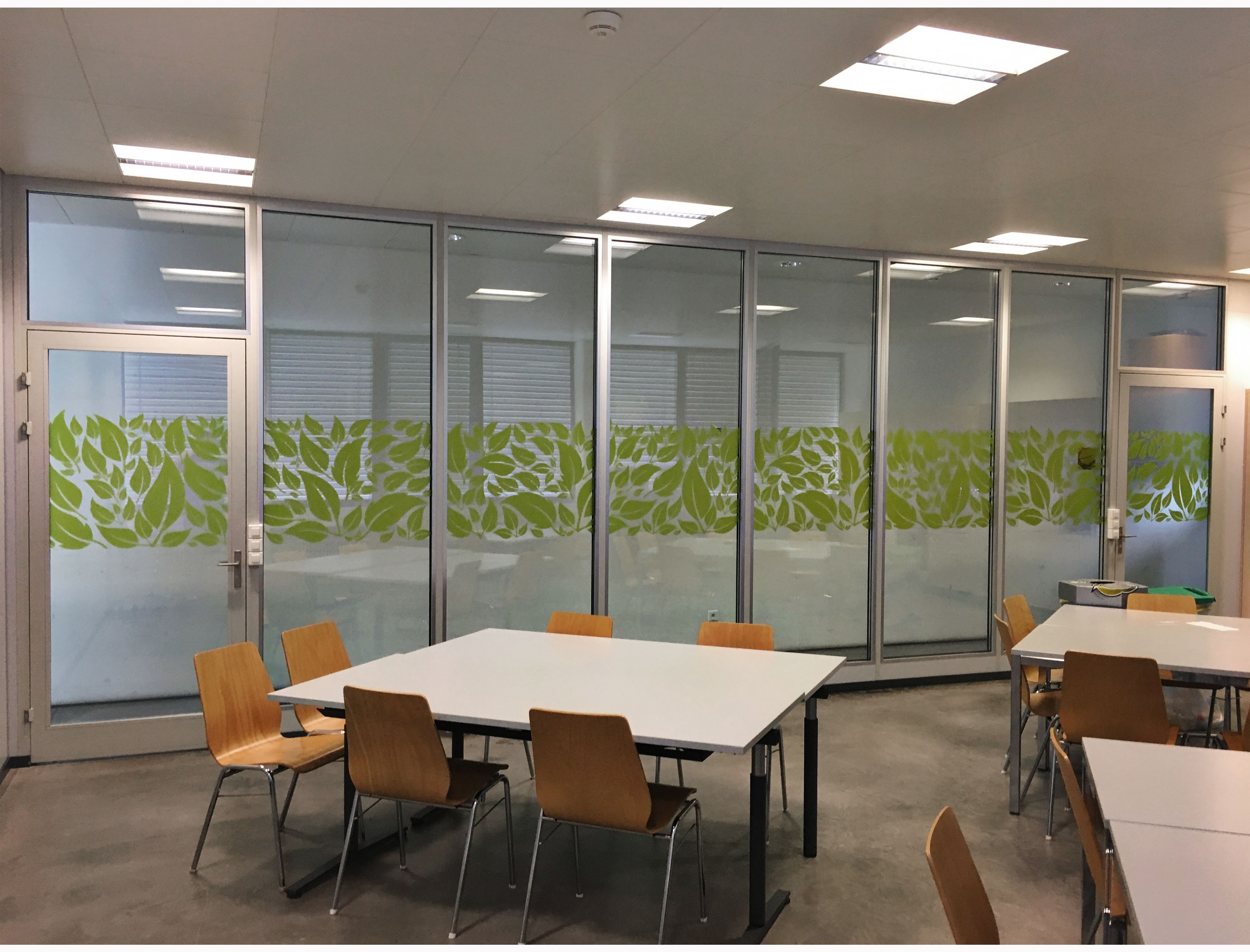 Ein Sichtschutz kann auch verspielt und dekorierend verwendet werden. Hier zum Beispiel, wurde die Sichtschutzfolie grün bedruckt. Anschliessend mit einem Blättermuster geschnitten um diese Kantine aufzupeppen.